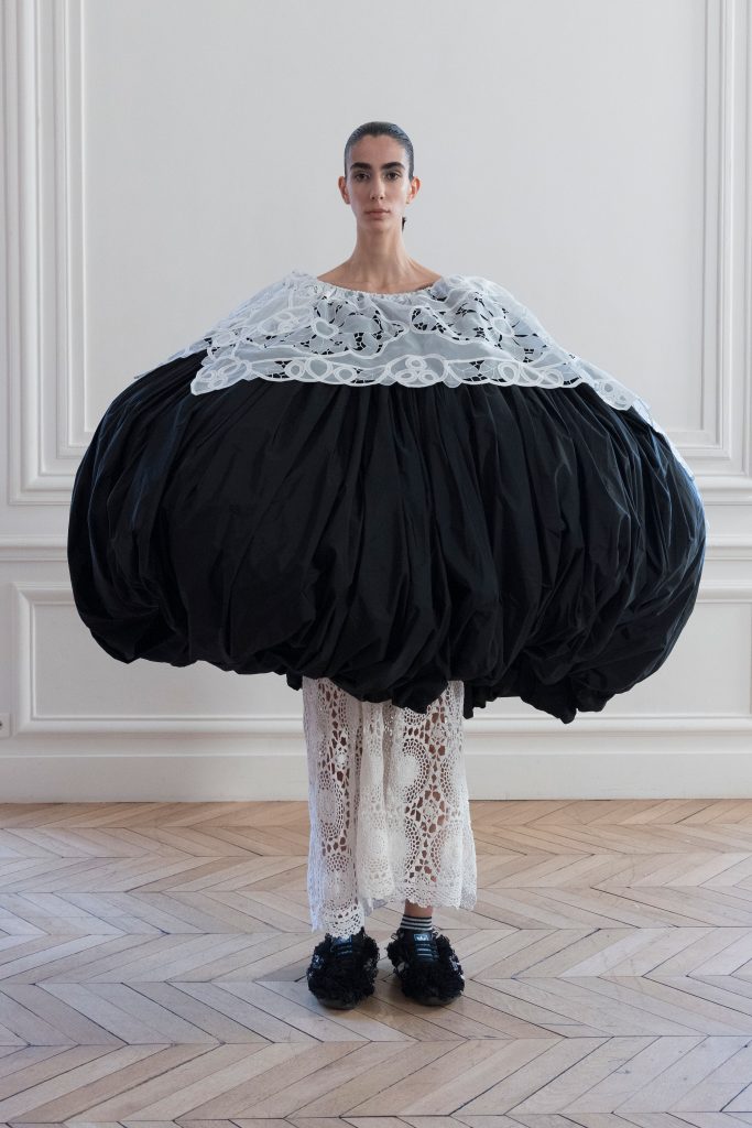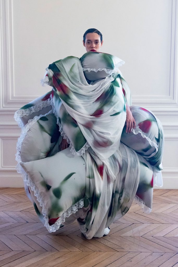 该系列以黑色、白色、粉色和蓝色为主,混合在一起形成了和谐的调色盘;采用大量大廓形,比如用包裹在丝质或蕾丝中的充气枕头,形成引人注目的连衣裙和上衣;品牌标志性的钩编工艺也运用到连衣裙的制作中;同时原创花卉图案是根据设计师透过窗户,拍摄的花朵照片创作,经过重新演绎后,呈现在罩衫和针织品中;此外品牌改造了 adidas originals 鞋履。