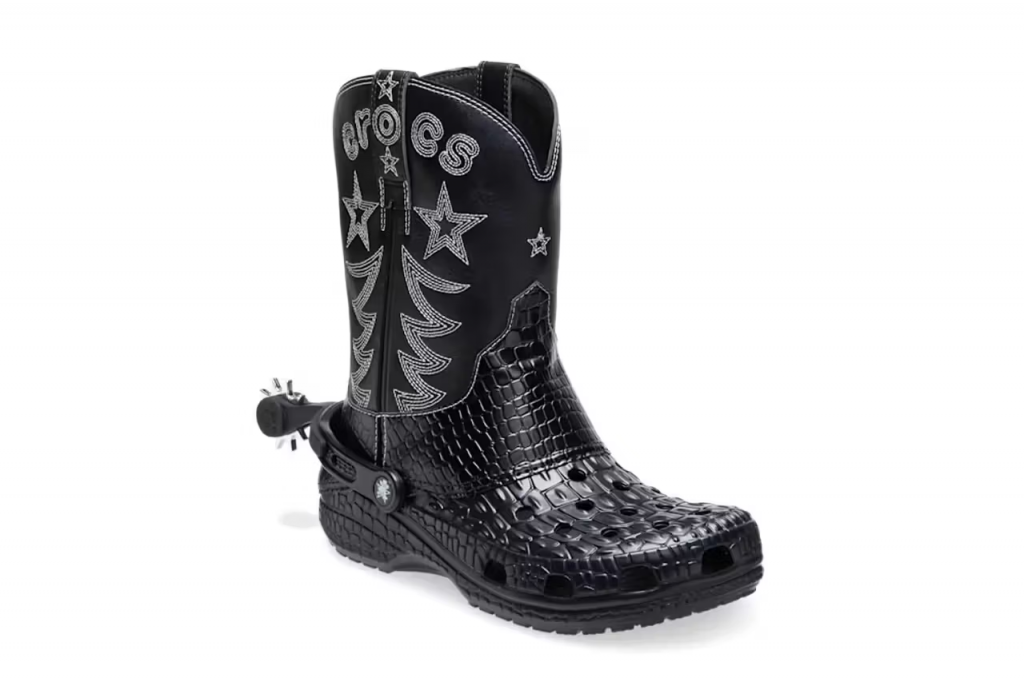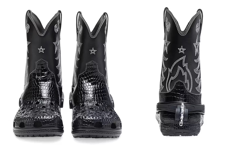 Crocs 对“洞洞鞋”的创意改造不止,日前品牌推出了一双特别的牛仔靴款“洞洞鞋”。在经典 Classic Clog 的基础上加入了高帮设计,并有融入高调的亮面鳄鱼皮纹理,鞋帮有西部风格的刺绣图案,后跟还有可以拆卸的马刺装饰,并有附赠智必星,整双鞋充满趣味。 它将在 10 月 23 日正式上市。