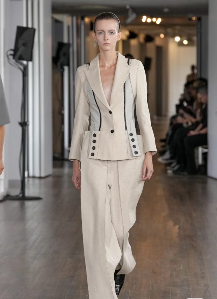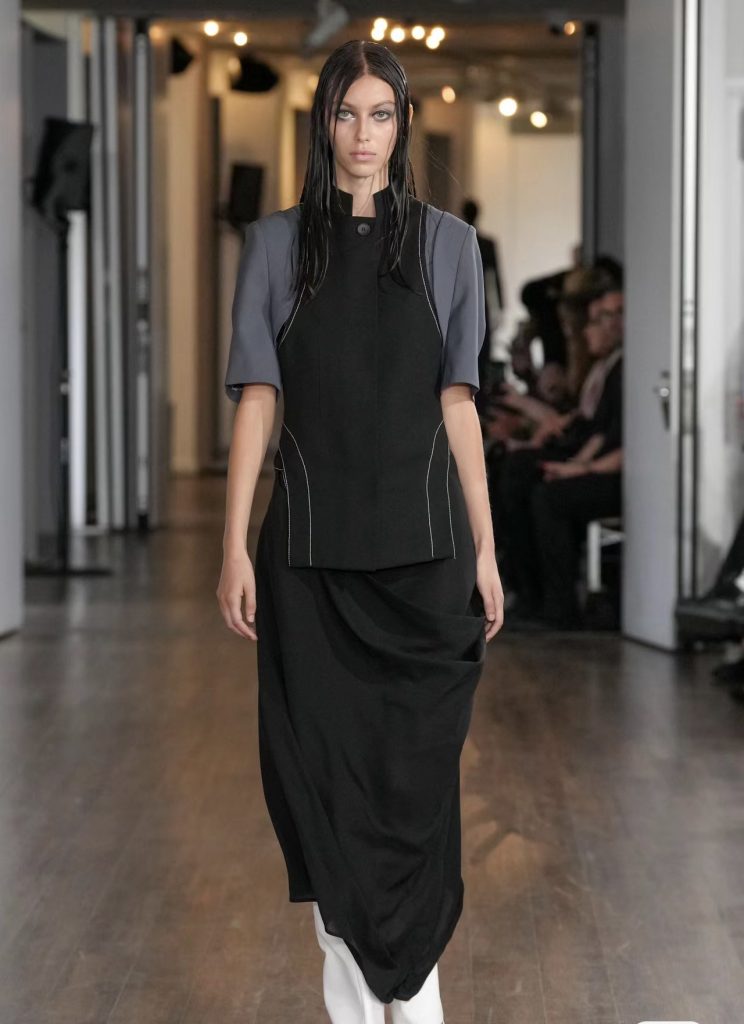 该品牌是一个致力于探索研究服装系统结构并具有变革意义的创新型女装品牌,每件衣服都可以拆卸成不同的组件并重新连接以创造新的外观。本季延续了品牌特色,以模块化实用主义和功能性为设计理念,从 1980 年代的中国军事风格中汲取灵感,并纳入了更日常与更柔和的造型款式。