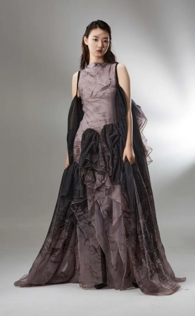 这一季,siyun huang 工作室继续演绎其具有标志性的动态时装艺术系列,以《《声外之物、生外之物、身外之物》为概念,用了蜻蜓、荷叶、雨、紫竹、粽叶等元素来展现“新芽、盛叶、枯枝和重塑”的生命周期过程。