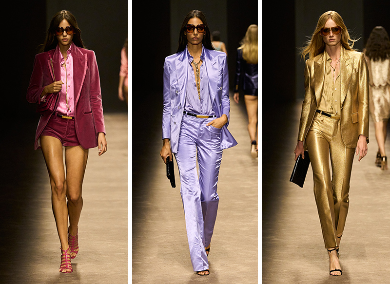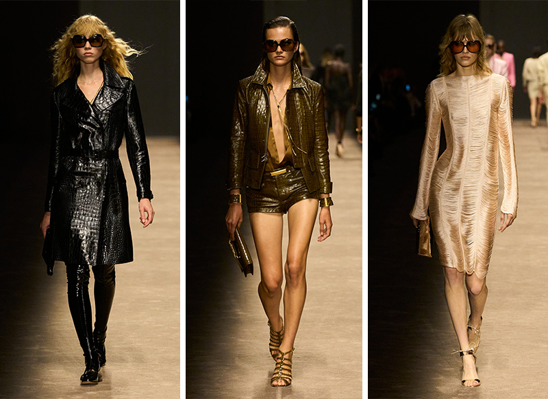 丝绸衬衫的领子解开到肚脐;修身西装搭配超短短裤;仿鳄鱼皮材质的半身裙配有拉链,可开衩到大腿;所有女模特都是细高跟配大墨镜,是华丽性感、气场强大的 TOM FORD 女郎。