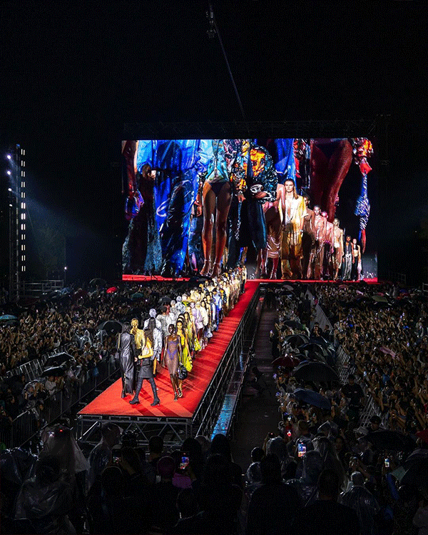 时装秀在户外举行,面向公众开放,聚集了大约 7000 多人,秀场上展示了超过 100 套造型,整个狂欢派对持续了 8 个小时。秀场背景是一个 26 x 16 米的巨型屏幕,秀后几天还免费向公众放映了多部电影。