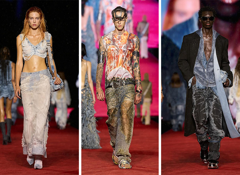 在系列大胆狂野的背后,可以看到设计师对于工艺的掌控,尤其是针对品牌标志性的牛仔面料,借由烧花、印染、做旧、拼接、多重水洗等工艺,赋予了牛仔更丰富的表现力。