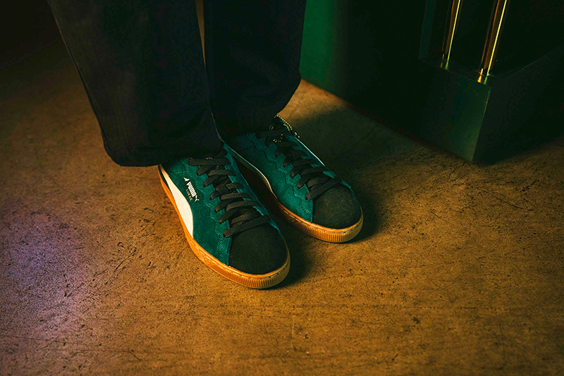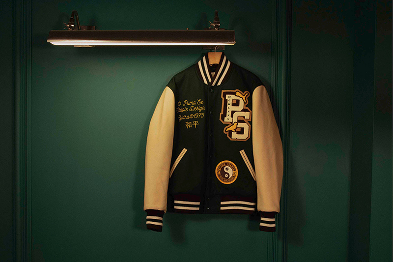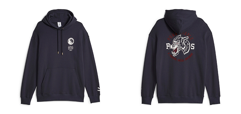 同时系列还有联名鞋款,它们分别以 Slipstream 和 Suede 为原型,同时凹印烫金字样、鞋舌处的太极标志图案等元素体现了东西方文化的碰撞,另外鞋款还有 PUMA 美洲狮金属挂件,以此体现联名身份。