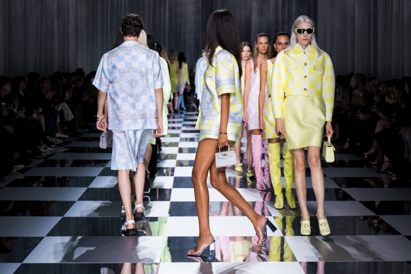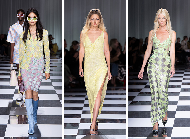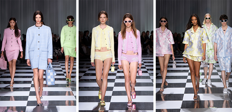 在 Versace 的 T 台上,Donatella Versace 带来了一个洋溢着青春气息的系列,就像是为《律政俏佳人》中女主艾丽所打造的衣橱。奶油色、柠檬黄、薄荷绿、淡粉色、天蓝色构成了本季轻盈灵动的色盘。短款背心裙、超短裤、剪裁利落的粗花呢套装、甜美的针织衫、弹力半透明雪纺裹身裙等一系列单品,都透着青春自信的气质。