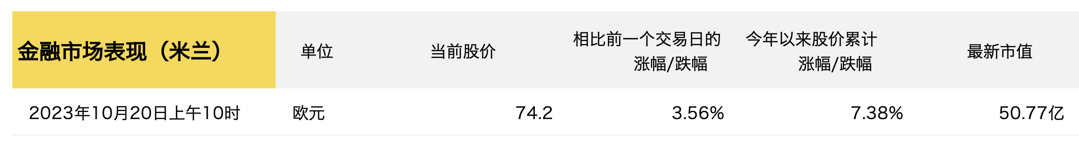 财报发布后的第二天,截至中欧时间10月20日上午10点,Brunello Cucinelli股价较上一交易日上涨3.56%,达74.2欧元/股。今年以来,集团股价已经上涨了7.38%,当前市值约51亿欧元。