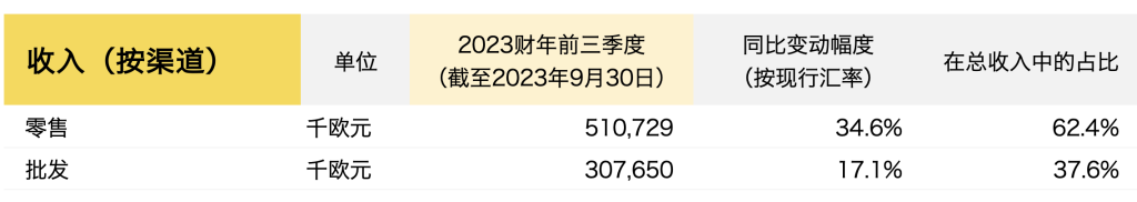 销售额同比增长34.6%至5.107亿欧元,占总销售额的比例为62.4%。可比门店销售额实现显著增长,2023秋冬系列的初始销售情况非常好。