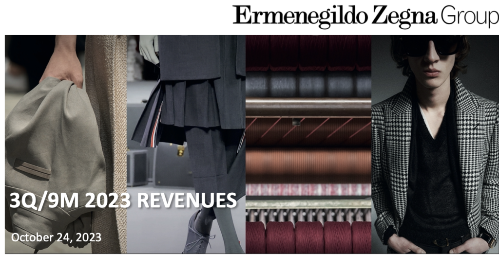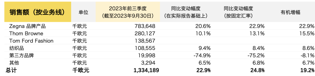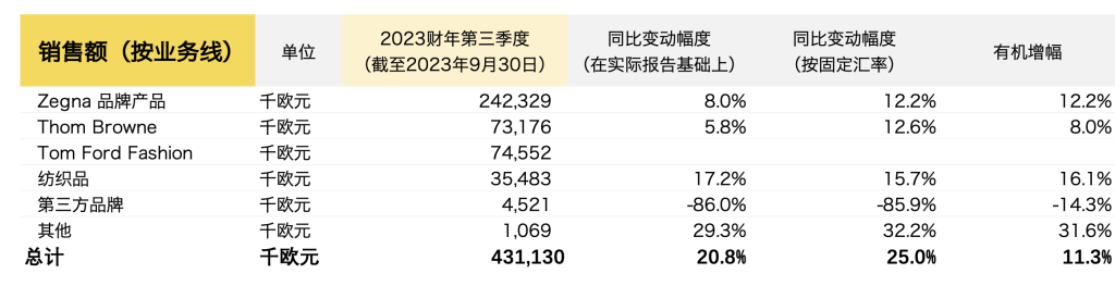 美东时间10月24日开盘前,意大利奢侈品集团 Ermenegildo Zegna(杰尼亚)公布了截至9月30日的未经审计的2023财年第三季度及前9个月主要财务数据:得益于 Zegna 品牌产品的强劲表现,尤其是在直销渠道的表现,集团第三季度收入同比增长20.8%(按固定汇率计+25%)至4.31亿欧元,有机增幅为11.3%。此外,前9个月收入同比增长22.9%(按固定汇率计+24.8%)至13.3亿欧元,有机增幅19.2%。