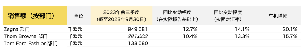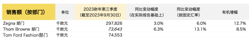 Tom Ford Fashion 部门:自2023年4月29日将Tom Ford International LLC并入集团财务报表以来,Tom Ford Fashion 已成为集团新的运营分部,包含所有与TOM FORD FASHION 系列相关的活动,覆盖从系列创作和开发到商品生产、销售,包括零售和批发的各个环节。2023年4月29日至9月30日,该部分收入为1.39亿欧元,其中第三季度收入为7500万欧元。