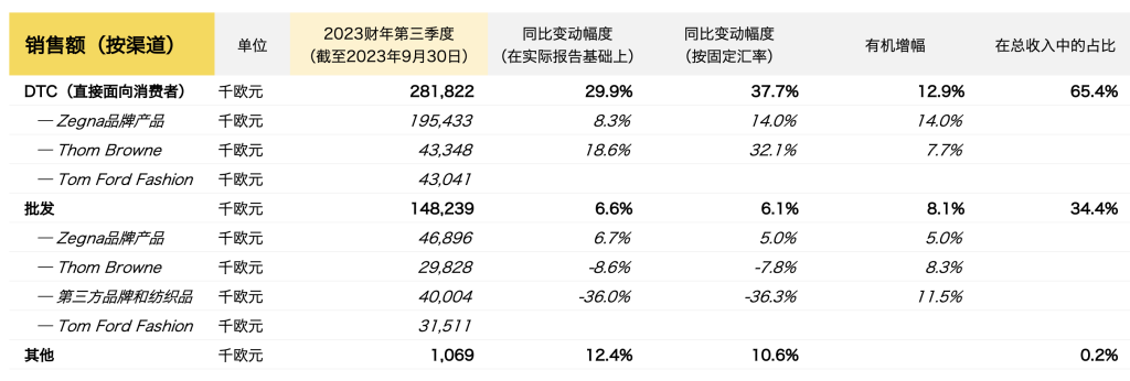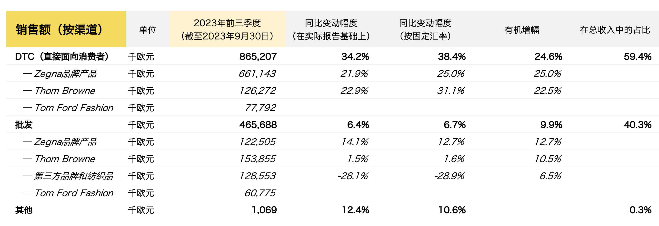 DTC(直销):第三季度收入同比增长29.9%至2.82亿欧元,按固定汇率计增长37.7%。其中Zegna 品牌产品DTC收入同比增长8.3%至1.95亿欧元,主要得益于门店生产力提高;Thom Browne的DTC收入同比增长18.6%至4300万欧元,主要得益于韩国业务由批发转向直销;TOM FORD FASHION 业务DTC收入为4300万欧元。
