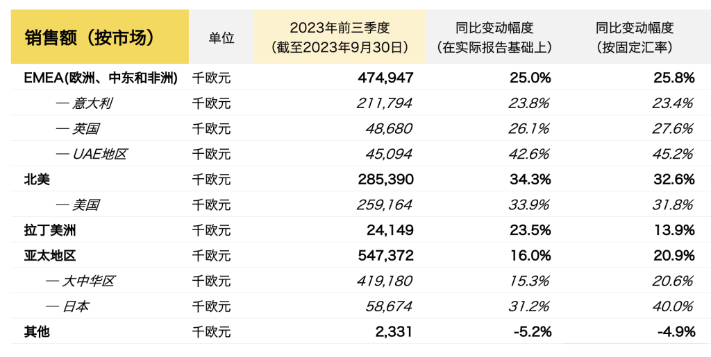 EMEA地区:第三季度收入同比增长27.7%至1.52亿欧元,有机增幅为18.5%。受DTC 渠道强劲需求推动,ZEGNA 和Thom Browne 品牌第三季度在欧洲和中东地区收入均实现两位数增长。