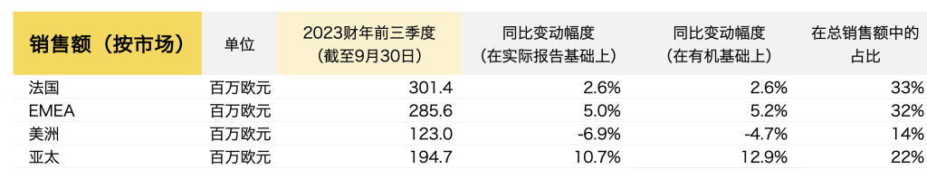 法国:第三季度,持续通货膨胀导致客流量减少,也影响了当地消费者和游客的购买力,不过第三季度业绩表现还是超越了法兰西银行等机构预期。第三季度数字渠道销售实现可比正增长,整体零售网络(包括直营店、特许经营店、联营店、折扣店等在内的所有零售销售点)销售表现保持稳定。