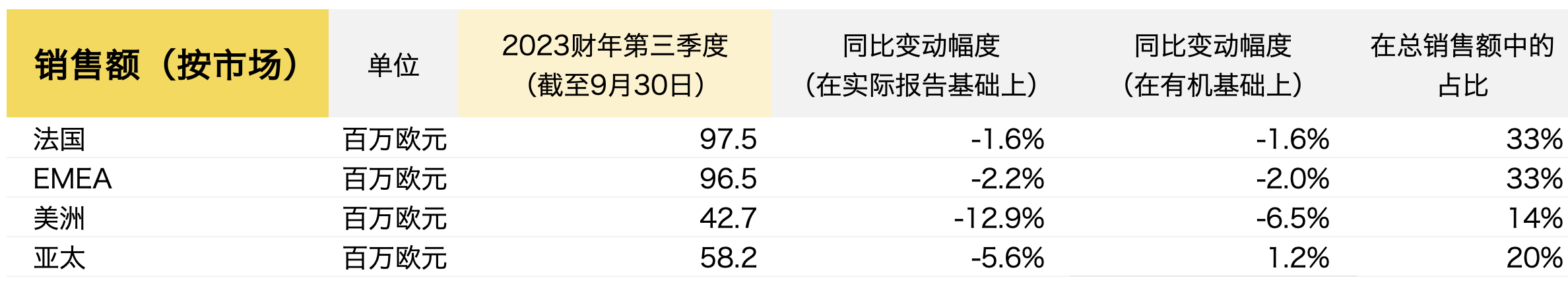 亚太:前9个月销售额有机增长13%至1.95亿欧元。第三季度销售额有机增长1%。在经济缓慢复苏且还疲弱的环境下,大中华区第三季度销售额同比略有上升,新加坡和马来西亚等其他亚洲市场呈现出更积极的势头。第三季度,亚太市场零售网络继续扩张,增设了17家零售点,主要位于韩国、中国和越南地区。