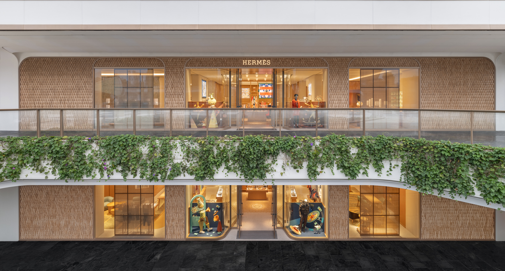 新店仍旧由巴黎建筑事务所 RDAI 设计。店铺分为上下两层,设有完整的对外入口。首层包含男士成衣与鞋履,以及家居、包袋与小皮具区等。楼梯后方的整面墙壁均覆以柳条编织,营造温馨宜人氛围,致敬成都传统竹编技艺。