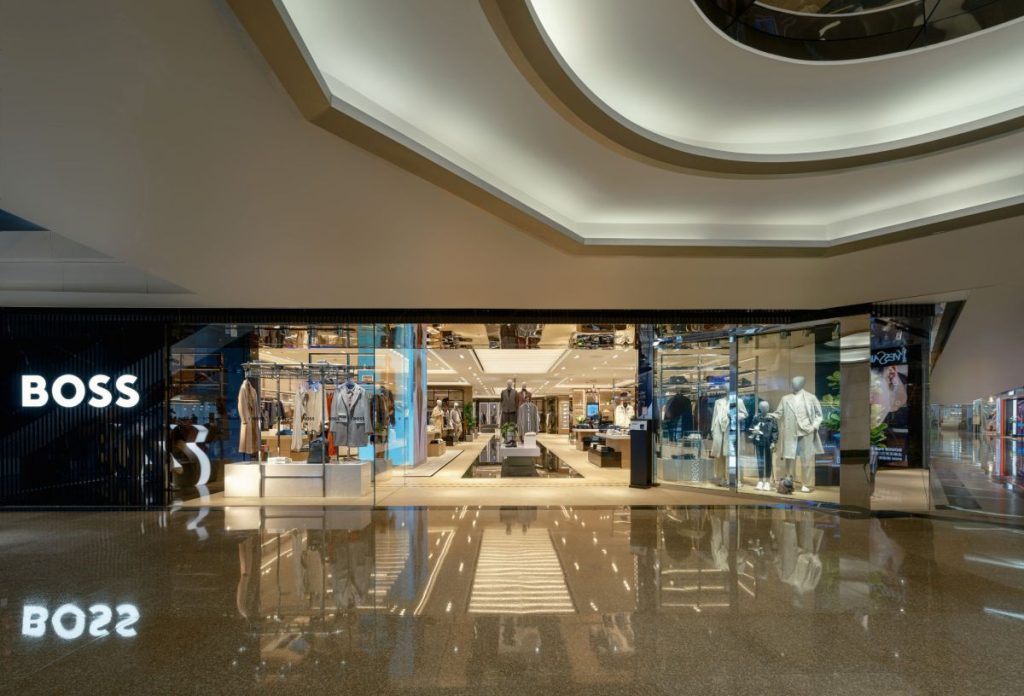 BOSS 在广州天河城开设中国首家品牌概念店,店铺入口处的AR(增强现实)橱窗,店内设有游戏互动大屏,根据特定系列发布不同的主题游戏,以及虚拟穿搭体验屏。 店内陈列男女装成衣、经典商务正装、高性能西装和休闲运动系列,全新臻品系列和专属量身定制区域,及鞋履和配饰以及香水、太阳镜和宠物配饰系列等全线精品,并首次引入BOSS童装系列。