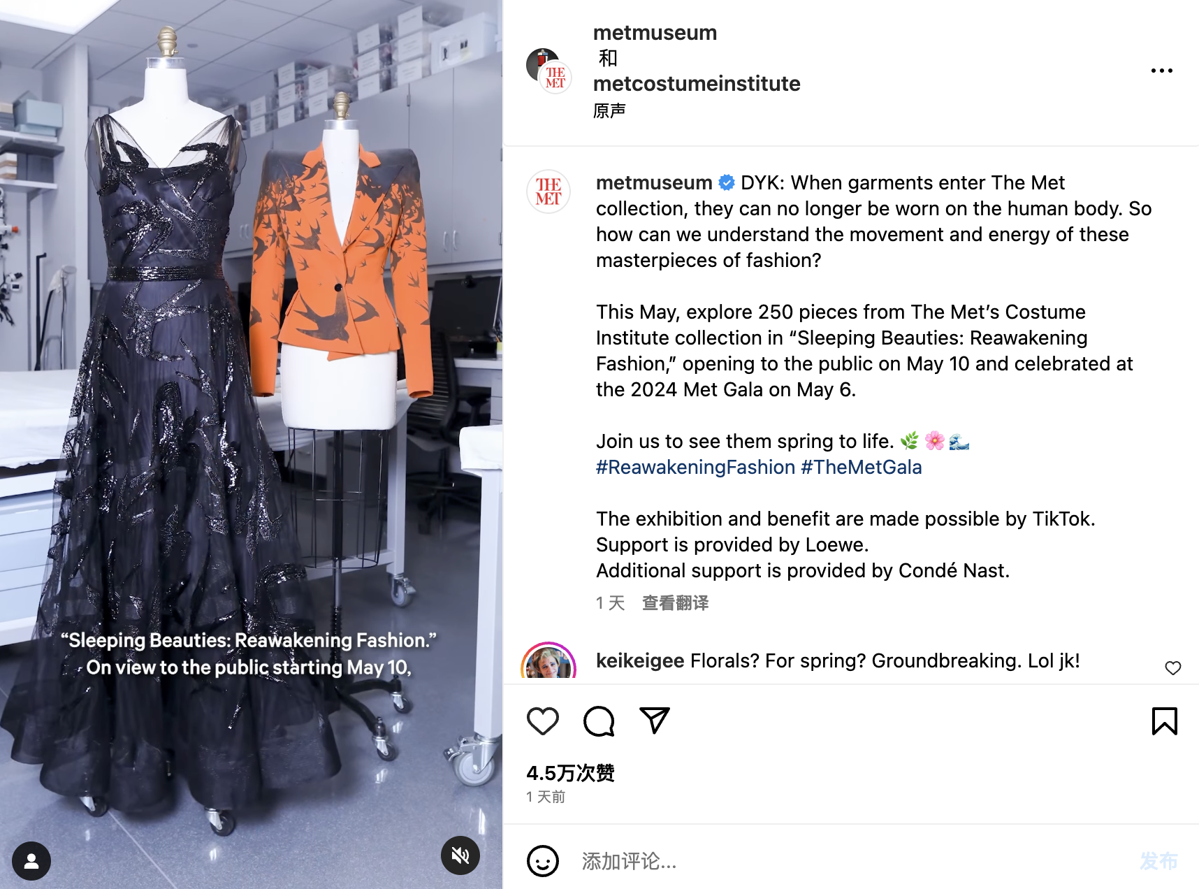 大都会艺术博物馆馆长 Max Hollein 表示,“‘Sleeping Beauties: Reawakening Fashion’将通过唤起人们在穿戴时的感觉、动作、声音、气味和互动来增强观展者与这些时尚杰作的互动,最终让我们更深入地欣赏所展出作品的完整性、美丽和艺术才华。”