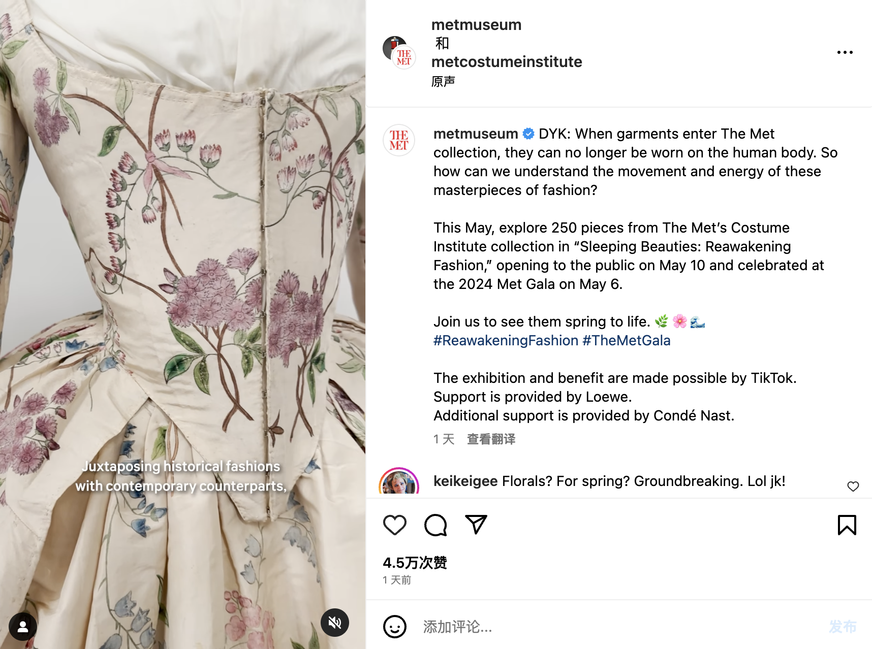 据悉,明年的晚会及展览均将由视频社交平台 TikTok 赞助并联合主办。对此,大都会艺术博物馆知名时尚策展人、服装学院院长 Andrew Bolton 表示:“就该节目如何在全球范围内实际传播而言,我们确实希望拥有尽可能最大、最广泛的平台。”