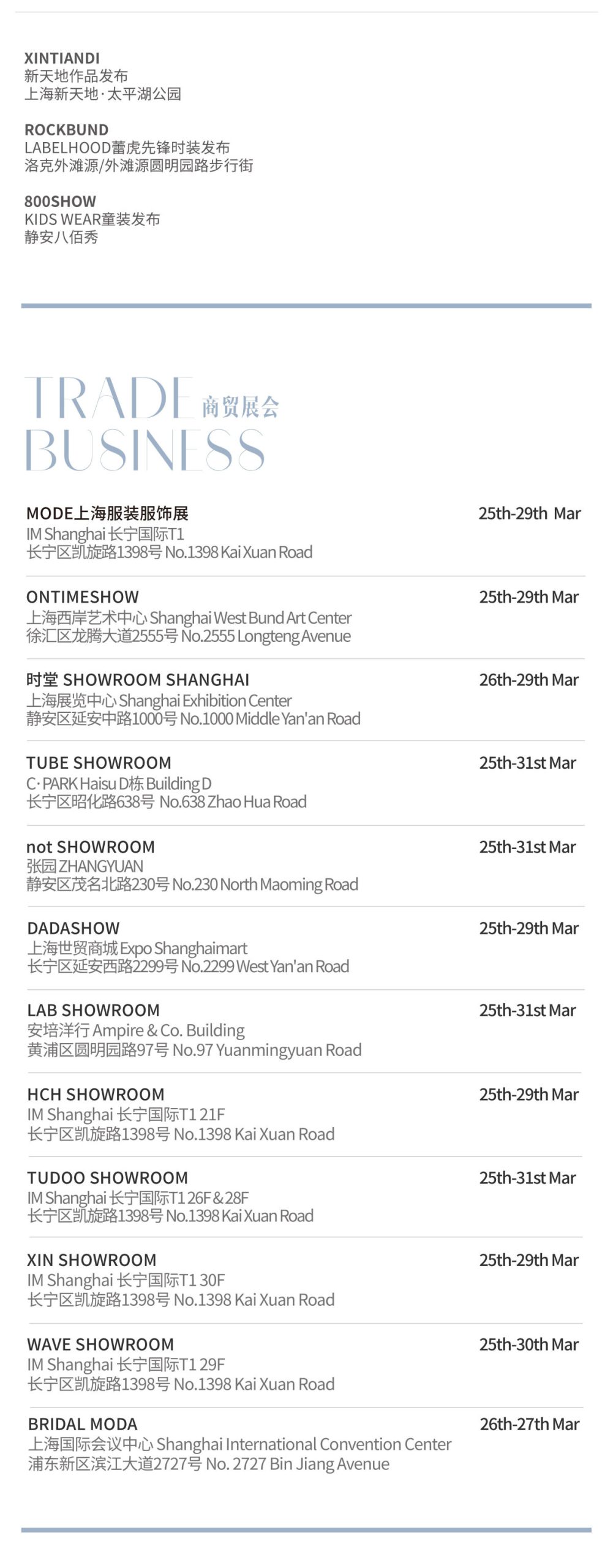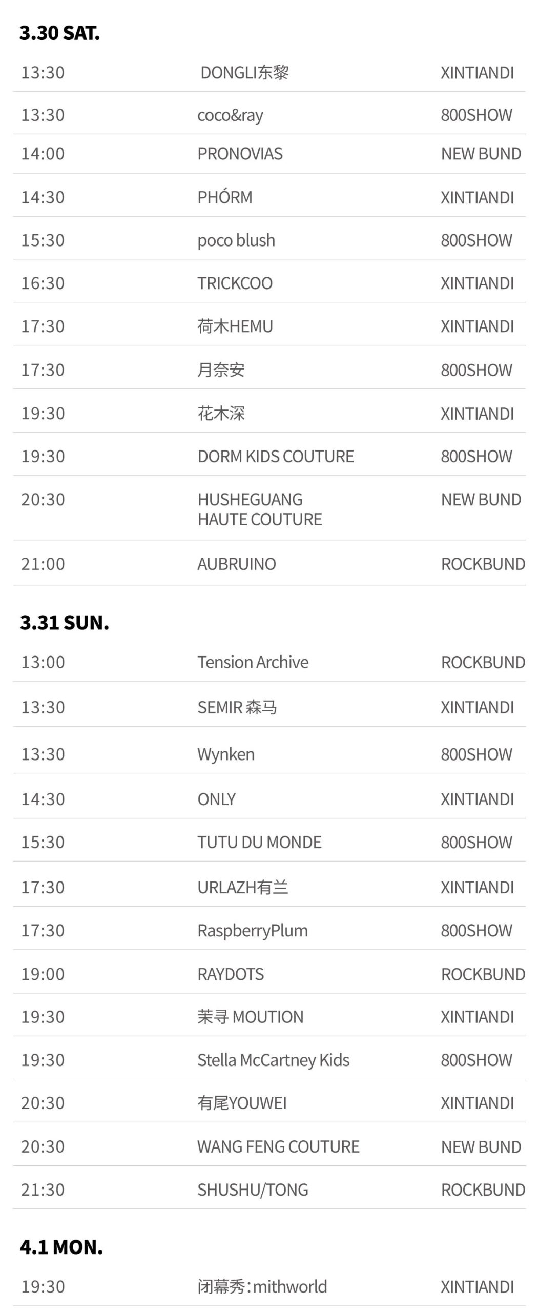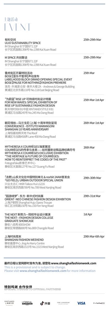 本季上海时装周聚焦“新中式、新环保、新运动”等热议话题,将由上海本土服装品牌 Le Fame拉飞姆于3月25日带来开幕大秀,中国原创设计品牌 mithworld 作为闭幕秀品牌,还有 COMME MOI、 JUDYHUA、XIAOLI 和 Louis Shengtao Chen 等品牌也将亮相本季时装周。