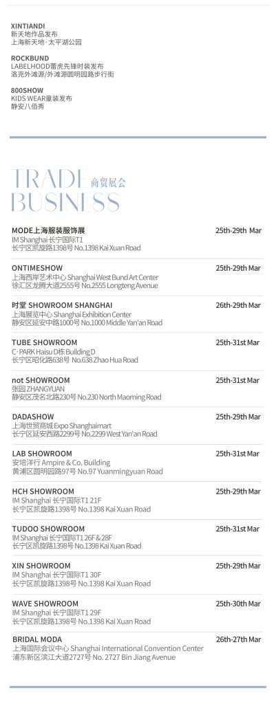上海时装周也将继续打造“亚洲最大订货季”,囊括十余家展会、showroom,MODE上海服装服饰展继续亮相IM Shanghai 长宁国际,特别集结了从2015年展会创办至今历届特色参展品牌,如TRICKCOO、SORONA、TRIP&CO、RAXXY瑞希等。