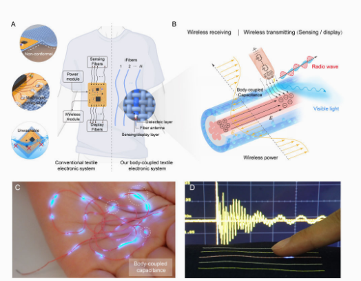 该研究提出了基于“人体耦合”的能量交互机制,并成功研发出集无线能量采集、信息感知与传输等功能于一体的新型智能纤维。用这种纤维编织制成的智能纺织品,无需依赖芯片和电池便可实现发光显示、触控等人机交互功能。