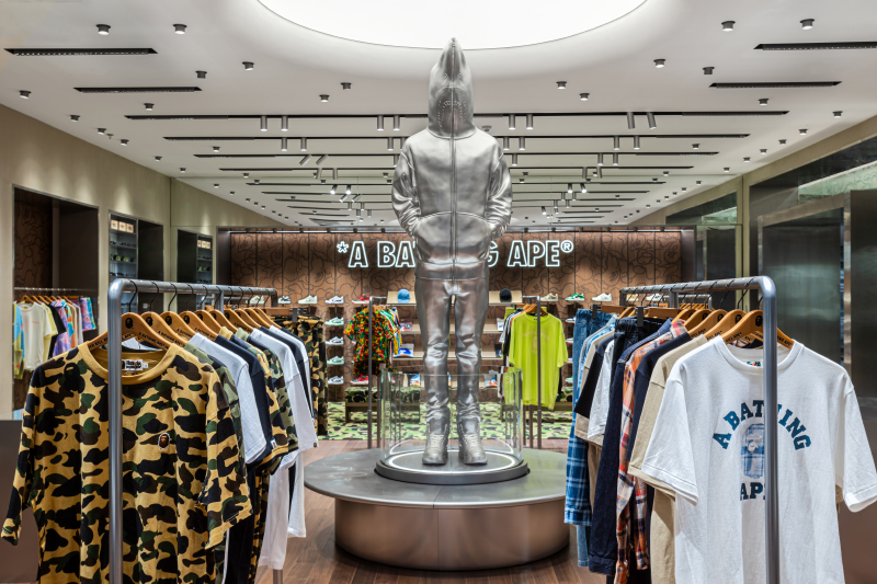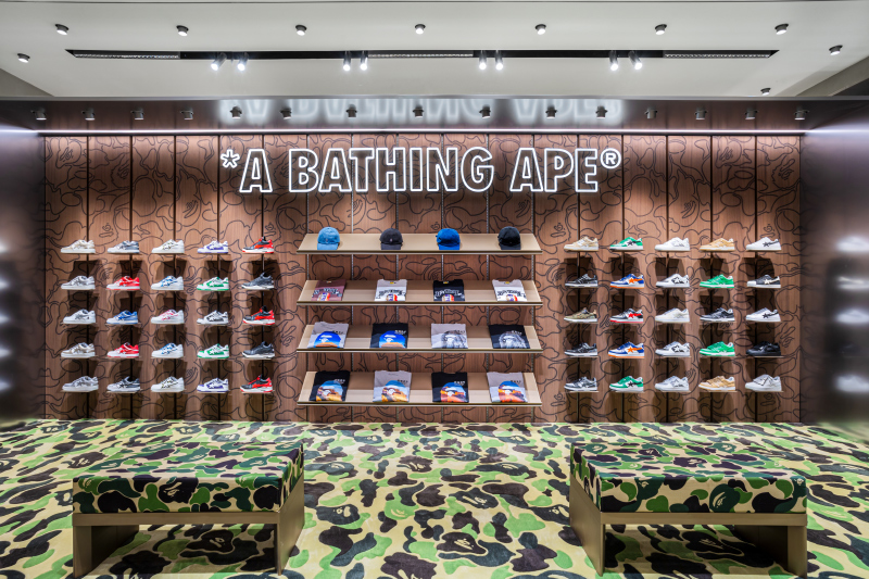 位于青岛万象城的 BAPE STORE 正式焕新亮相。2015 年 BAPE 在青岛万象城开出门店,这也是品牌的青岛首店。 重装亮相的门店采用了品牌全球专卖店一致的未来科幻美学,不锈钢墙体、LINE CAMO 迷彩图纹等元素非常醒目,店中央还有 SHARK SEIJIN 鲨星人,BAPE STA 鞋区还有迷彩沙发的布置。