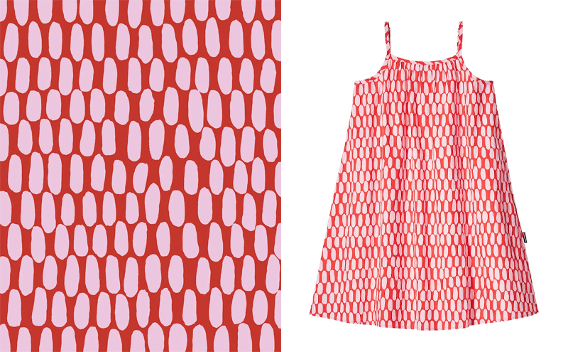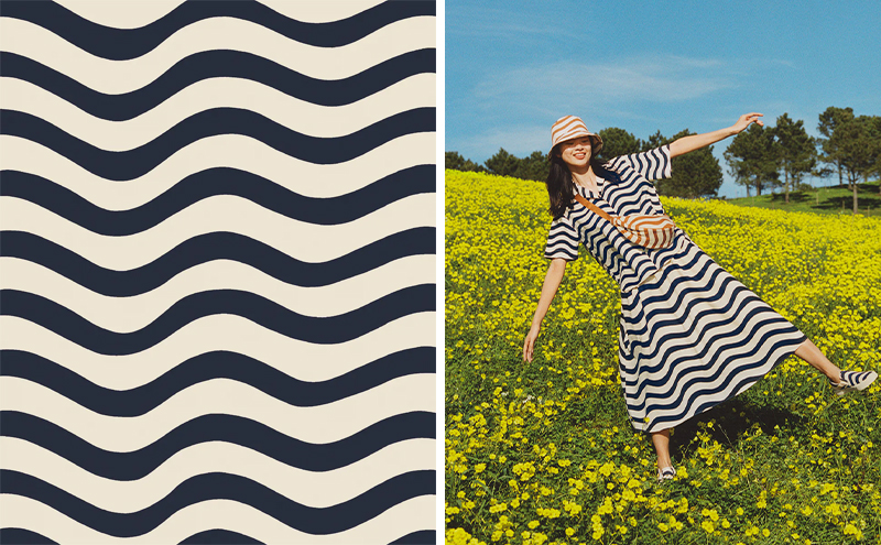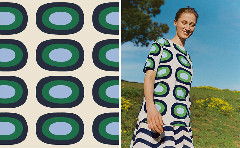 系列也继续用到了设计师 Pentti Rinta(本蒂·林塔。Maija Isola 和 Pentti Rinta 正是上一季合作系列用到的印花图案的两位设计师)的两款抽象图案,分别是让人联想到海洋的波浪线图案 Lirinä(潺潺流水),以及他在上世纪 70 年代设计的 Asema(车站)。