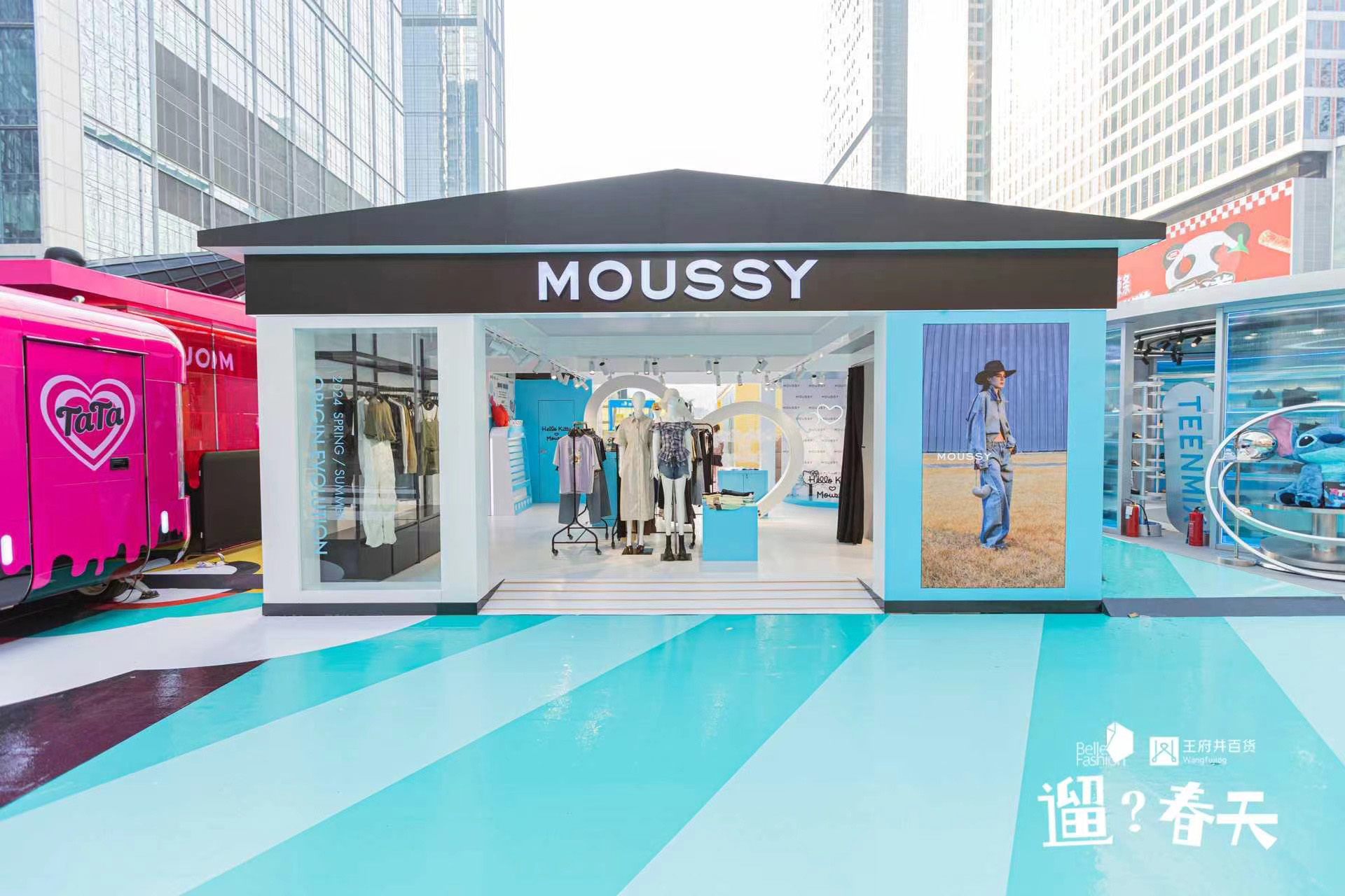 在呼应街区春意盎然的基调的同时,各家品牌快闪空间的设计也体现了不同的风格和主题:TATA 快闪店变身冰淇淋店,主打的芭比粉色调很是亮眼,而联手研麻所带来的限时冰淇淋车也迅速成为现场最火爆的点位之一;STACCATO 快闪店一片绿意盎然,鲜花盛放,充满春天气息;MOUSSY 则是带来了 Hello Kitty 联名主题空间,用的是清新的蓝白色调。