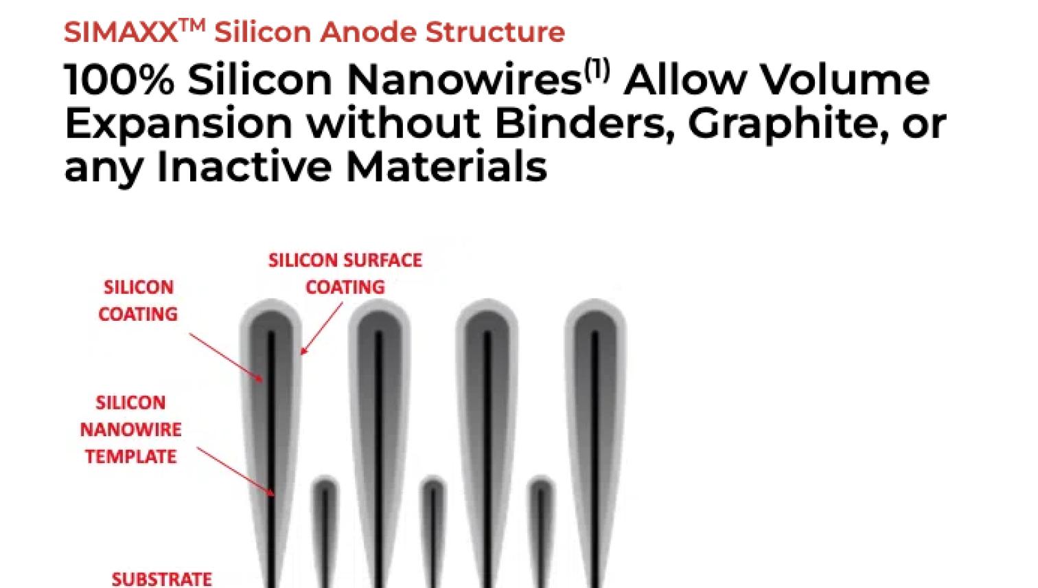 SiMaxx是Amprius公司独创的电池结构的最新商标名称,该结构将传统的石墨负极换成了纳米线结构的硅。硅能容纳多达 10 倍的锂离子,从而提高了能量容量,而纳米线结构则能更好地适应离子移动过程中的体积膨胀和收缩,从而防止硅降解。