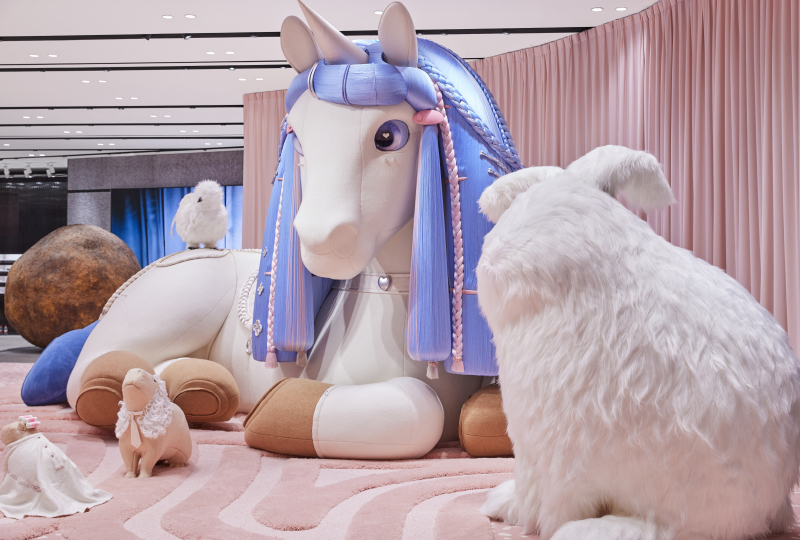 空间中有着甜蜜的氛围,并通过 GENTLE MONSTER 的诠释展现出超现实且充满想象力的梦境,当中有着独角兽元素,而独角兽还佩戴着各式发卡,这也呼应了这次联名系列的设计。