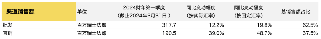得益于电商平台及门店客流量和成交量增加,尤其是亚太和EMEA(欧洲、中东和非洲)市场发展势头强盛,On 品牌2024财年第一季度直销(DTC)渠道净销售额同比增长39%,按固定汇率计增长48.7%,占总销售额的比例达37.5%(去年同期为32.6%)。