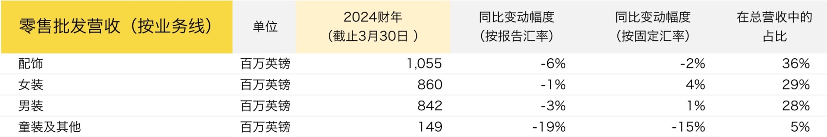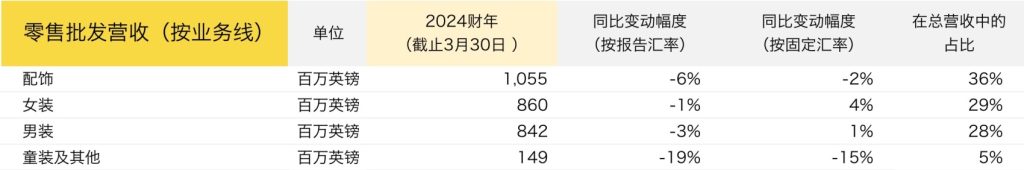 男装和女装成衣的销售均低于集团平均水平,2024财年销售额同比下降个位数。
