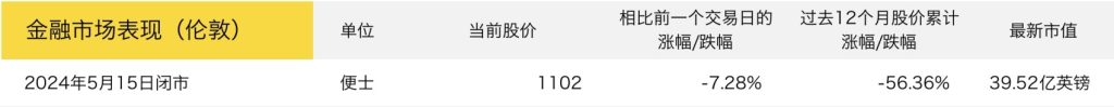 截止5月15日闭市,Burberry 的股价较上一交易日下滑7.28%至1102便士(11.02英镑),近12个月股价累计下滑56.36%,最新市值为39.52亿英镑。
