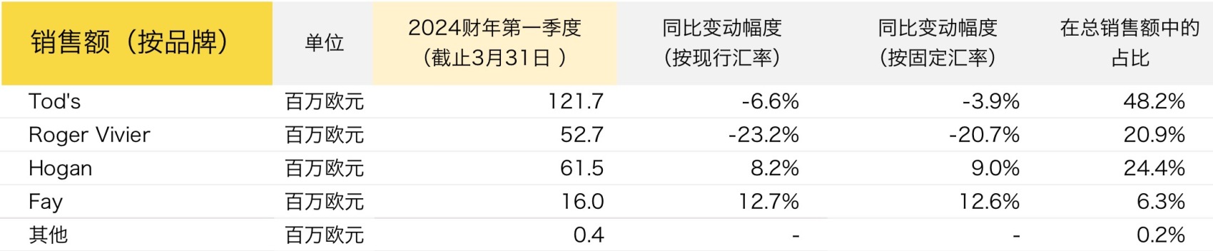 集团表示,旗下品牌的表现很不均衡,这反映了不同品牌销售额的地理构成:Tod’s 品牌和 Roger Vivier 品牌业绩明显受到中国市场疲软的影响。不过,所有品牌在欧美市场的表现都不错。