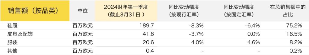 集团表示,过多地按产品类别分析整体营收意义不大,因为数据受到了亚洲市场疲软的影响,但集团“很高兴看到客户们对目前门店中产品的热情,以及对即将上市的秋冬系列新鞋履、皮具和配饰产品的良好反响”。