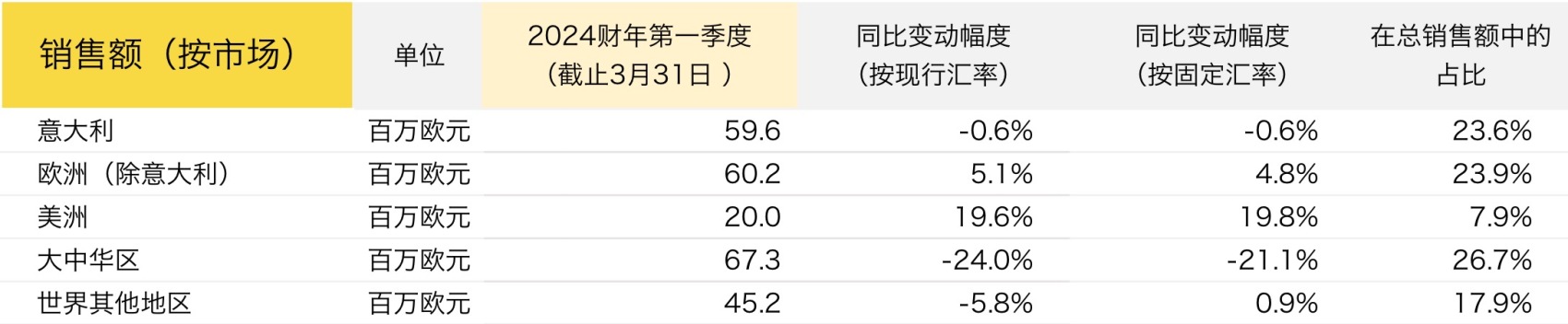 欧洲:集团表示,其在意大利国内和欧洲市场都取得了良好的业绩,这得益于当地稳定的需求和游客购买的重要贡献。