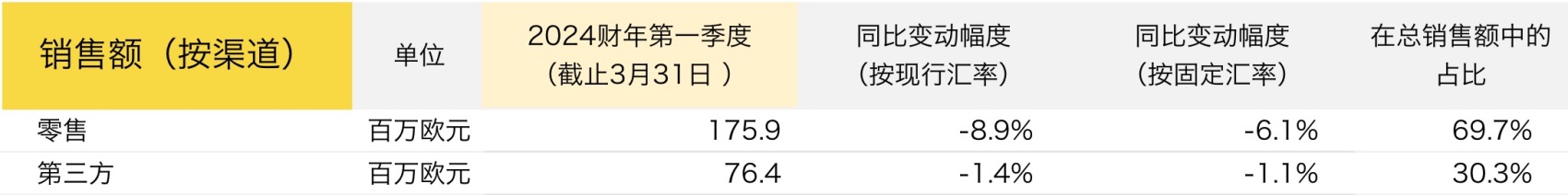 受门店客流量大幅下降、消费疲软、以及较高比较基础的影响,大中华区(包括中国大陆及港澳台地区)市场的表现不佳,同比下滑24%至6730万欧元(按固定汇率计同比下滑21.1%)。