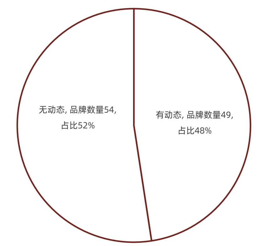 这49家品牌的相关动态总数为76个,平均每家品牌1.55件,中位数为1件。