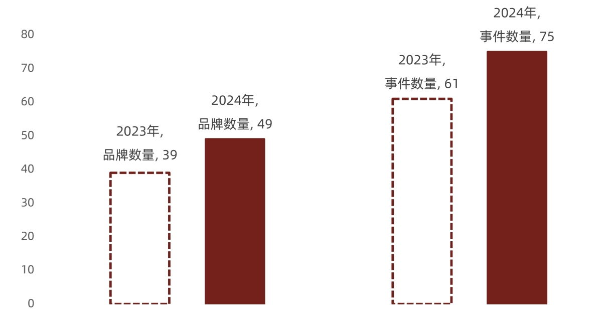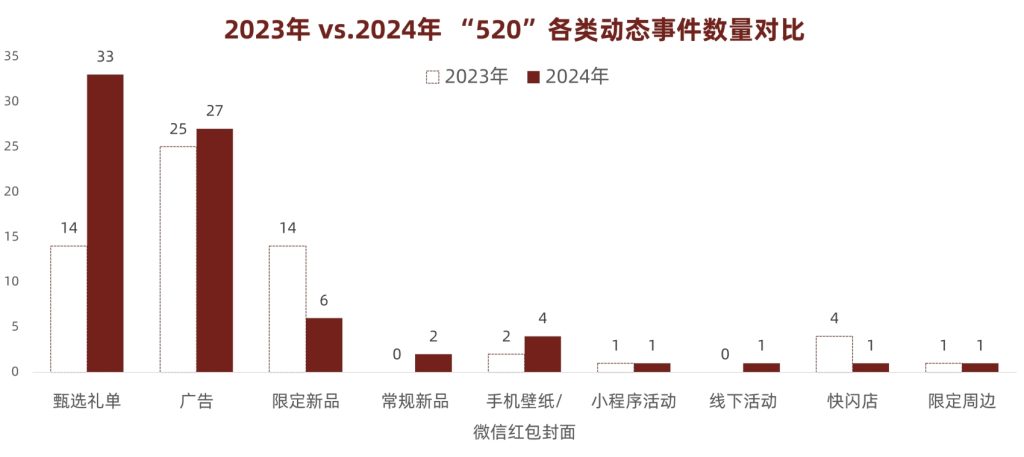图2 – 与2023年“520”相比,今年参与的奢侈品牌增加了26%,事件数量增加了23%,说明以“情感”为主题的节日营销对于奢侈品牌的重要性越来越高!