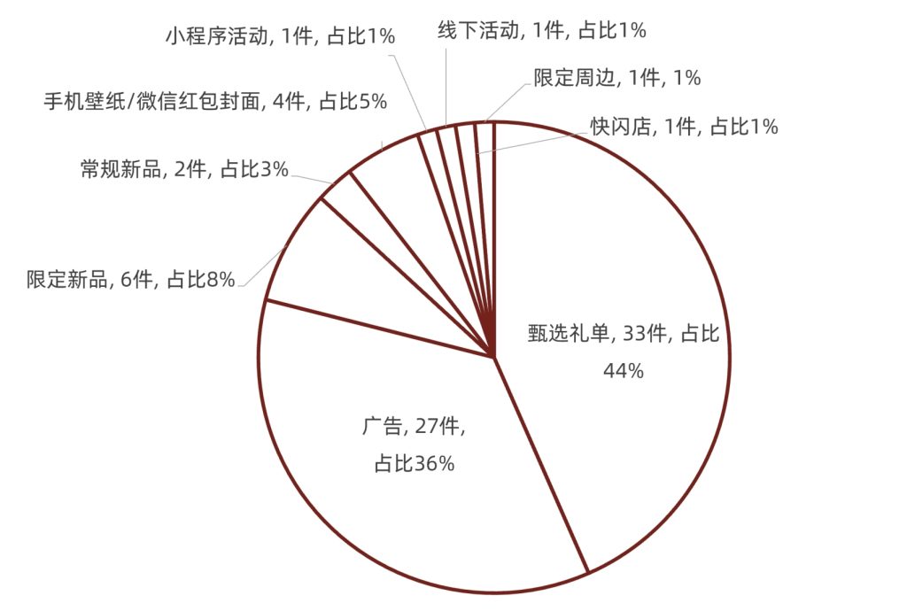 图4 – 从今年“520”奢侈品牌们发布的总计76条动态的类别来看,直接“带货”的“甄选礼单”排名首位,占比高达44%,显著超越以展示品牌形象为主的平面或视频“广告”(36%)。