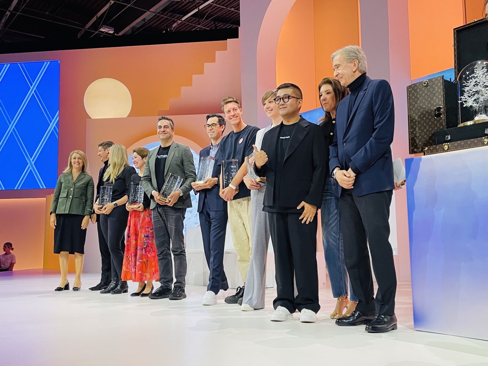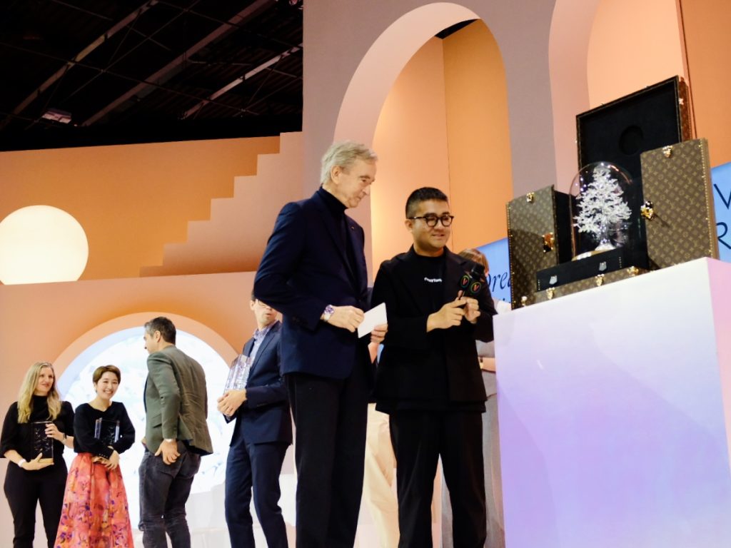 注:大奖的奖杯由迪奥设计,采用人工智能技术,以穆拉诺玻璃吹制,呼应 LVMH 集团展厅的主题“梦想花园”,奖杯箱由路易威登定制。