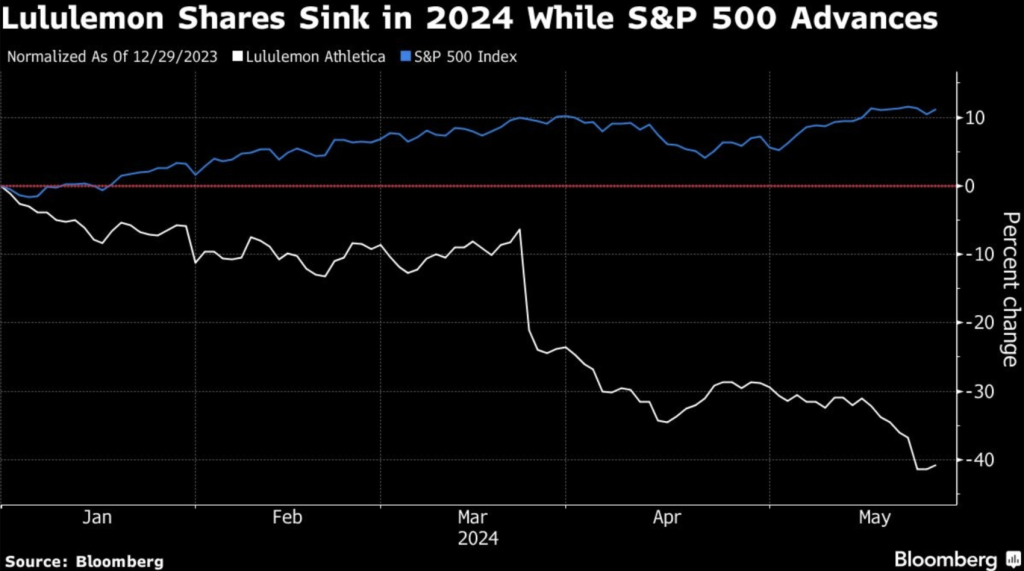 近年来,由于消费者对 lululemon 紧身裤及其他运动服的需求强劲,公司的股价大幅跑赢美国股市。然而,今年第一季度销售趋势疲软的迹象以及行业竞争的加剧给 lululemon 的股价带来压力。今年迄今,lululemon 的股价已累计下跌41%,是2024年迄今为止标准普尔500指数中表现最差的一支股票。