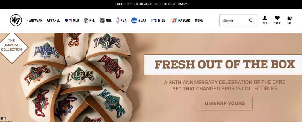 ’47 是一个私人控股的高端运动生活方式品牌,由双胞胎兄弟 Arthur D’Angelo 和 Henry D’Angelo 于1947年在马萨诸塞州波士顿创立。起初,D’Angelos 兄弟在芬威球场周围的街道上销售锦旗和其他体育纪念品,并从中看到了体育授权的未来,逐渐将他们的业务从单一的街头球车发展成为一个将运动和风格独特融合为一的顶级运动生活方式品牌。目前,’47 是美国职业棒球大联盟、美国国家篮球协会、国家橄榄球联盟、国家冰球联盟、全国改装赛车竞赛协会(NASCAR)、超过 900 个大学项目和许多国际足球俱乐部的官方授权商。