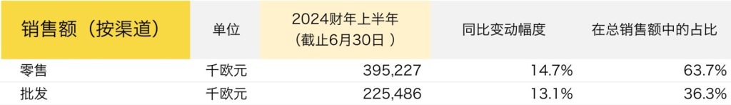 两大销售渠道的增长较为平衡:零售渠道销售额增长14.7%,批发渠道增长13.1%。