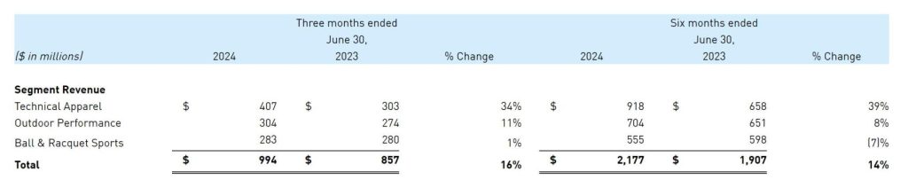 球类及球拍部门中 Wilson 品牌恢复增长,今年下半年的产品线表现强劲。该部门调整后的营业利润率为1.1%。此外,截至2024年6月30日,该部门直营门店为26家,较2023年6月底增加14家。