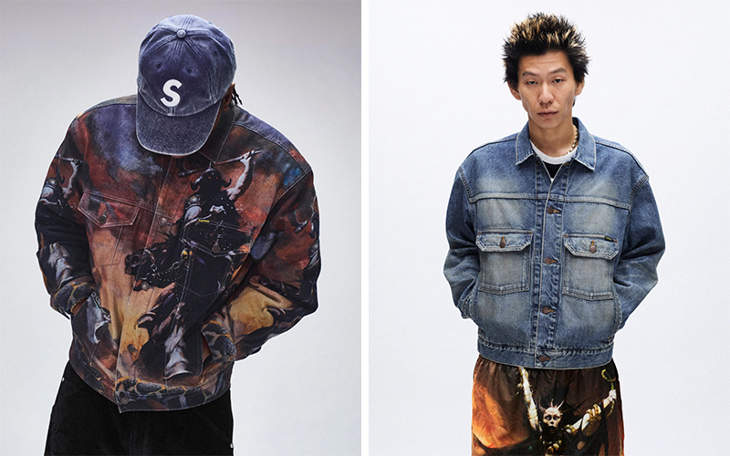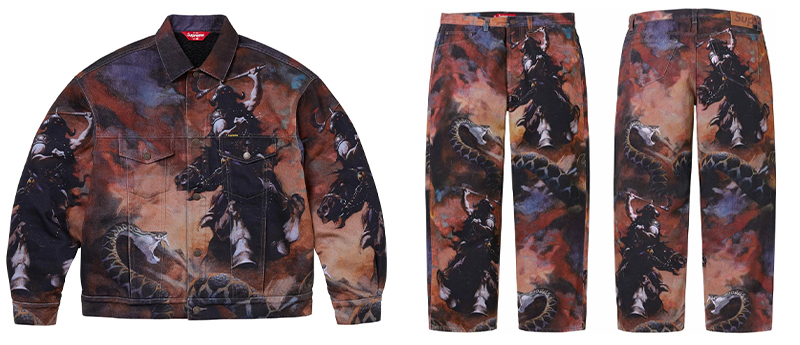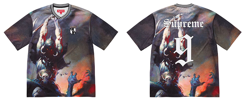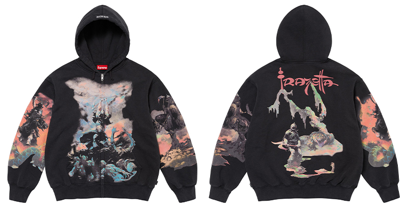 Supreme 和不同艺术家的合作也是每季值得重点关注的部分,2024 秋冬最重要的一组当属致敬了传奇漫画家弗兰克·弗雷泽塔(Frank Frazetta),品牌在多款产品中运用了弗雷泽塔的多件作品。
