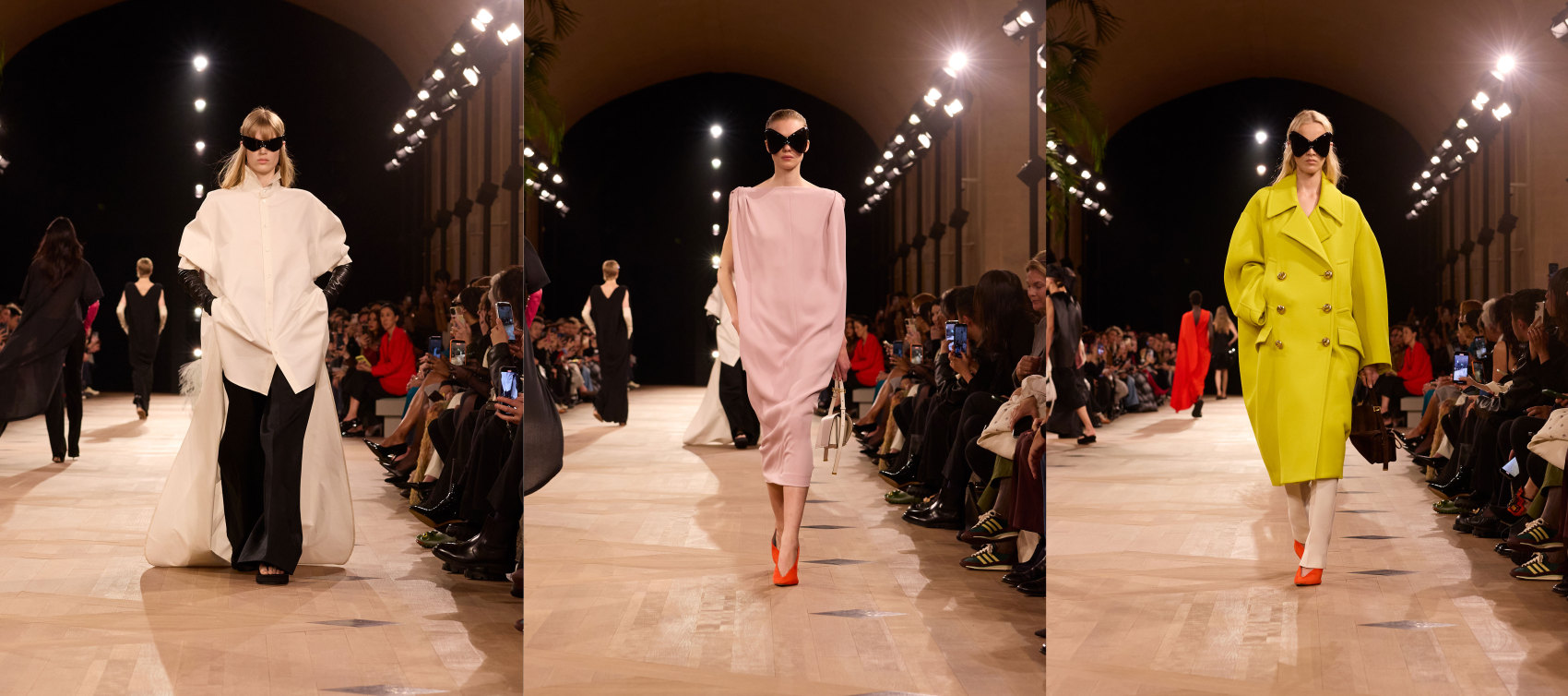 Pierpaolo Piccioli在新系列中继续探索面料与身体的关系,并推出了全新NEO GAZAR面料,在欧根纱层中融入了混纺纬纱,既延续标志性的空气感与轻盈度,又减少僵硬感,更契合高级时装剪裁需求。