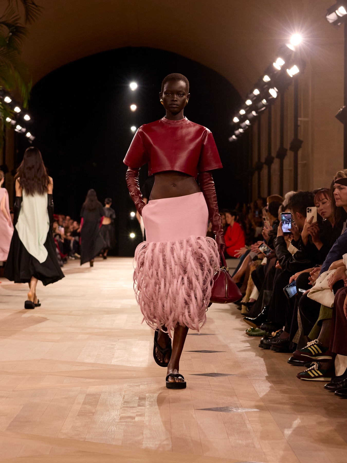 在巴黎世家夏季26系列秀场上,Pierpaolo Piccioli已经通过裙摆带有夸张羽毛边饰的连衣裙、雕塑感皮革短上衣以及毛皮般的及地长裙,展示了其精湛的技术功底。