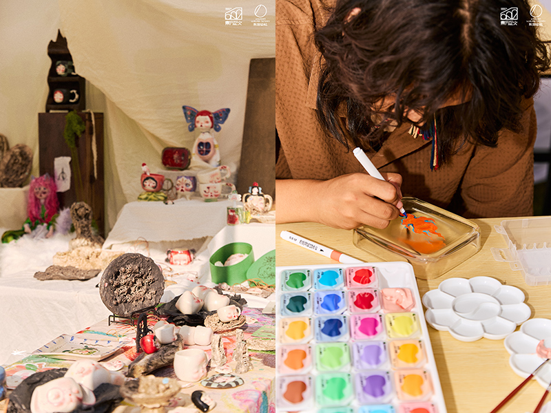 在市集部分,这次的“东市·相因集”集结了超级安踏、Dr.Martens、1807 等超过 25 个品牌,现场包括了服饰、配饰、生活好物等不同类型的产品,它们以亲民价格触达消费者。在工作坊部分,年轻人们在用陶瓷、玻壳并结合涂鸦带来项链、挂件等潮流配饰,这也契合了东郊记忆的工业基因与创意历史。