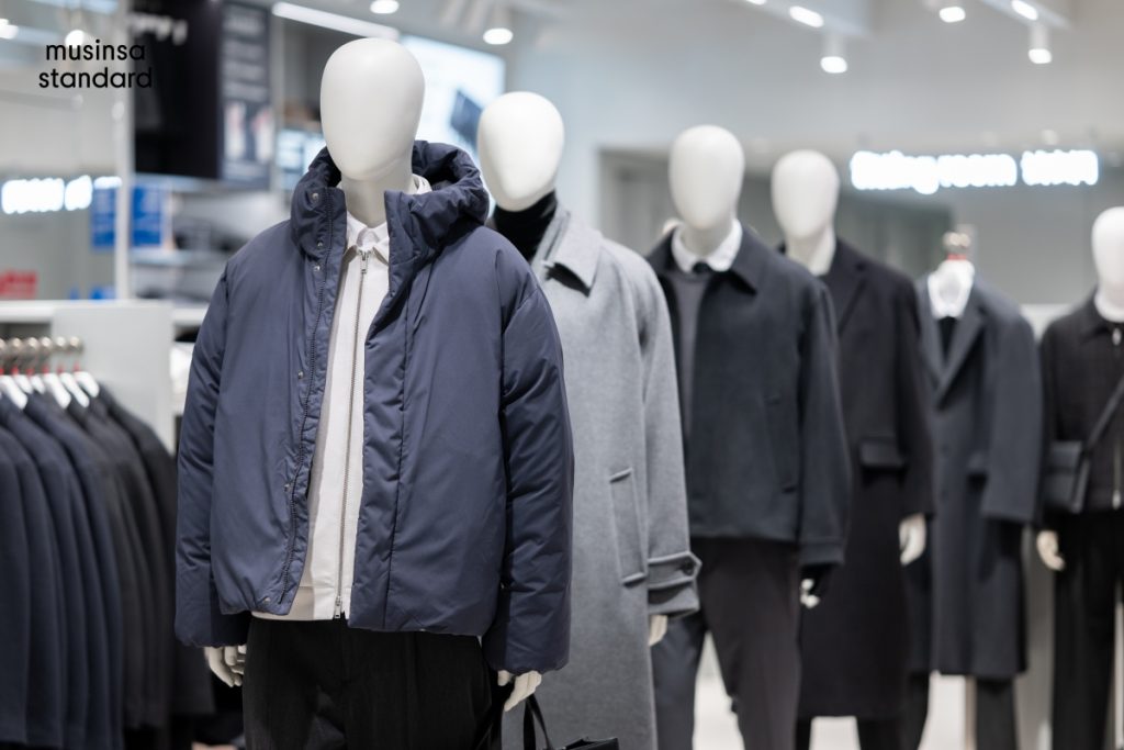 店内全面陈列 Musinsa Standard 男女装系列,涵盖近1500款服饰及配饰单品,一楼以女装为主,引入“都市游牧风”等,为消费者提供风格参考;二楼则以男装为核心,划分为聚焦经典单品的“当代都市区”与展现潮流功能的“工装丹宁区”。