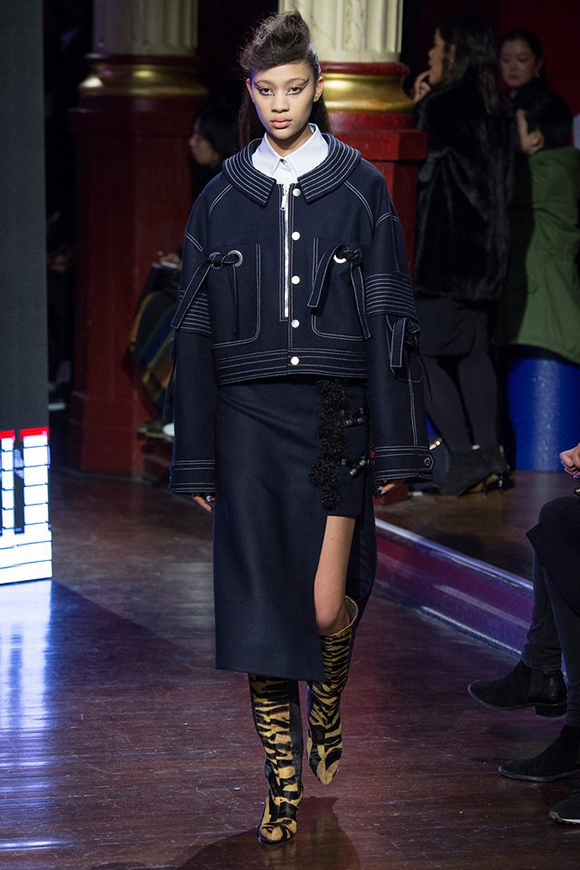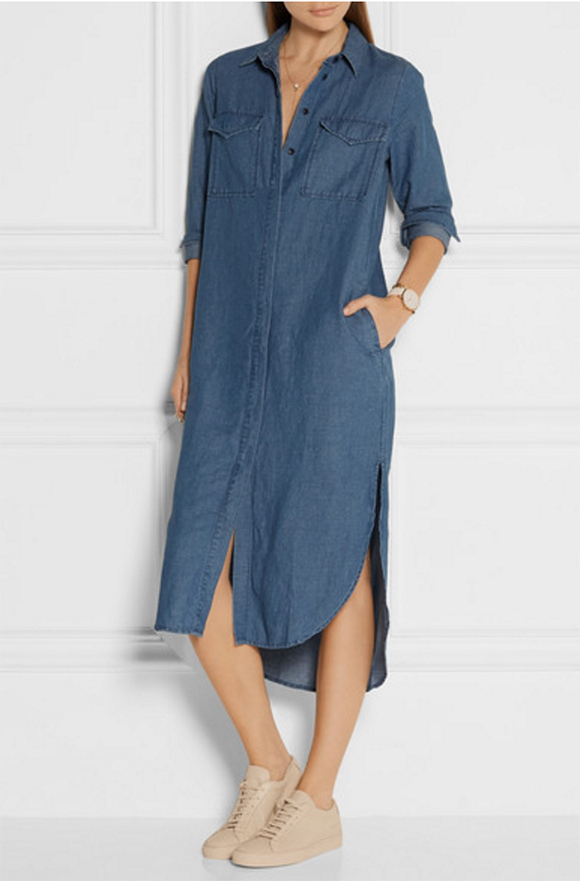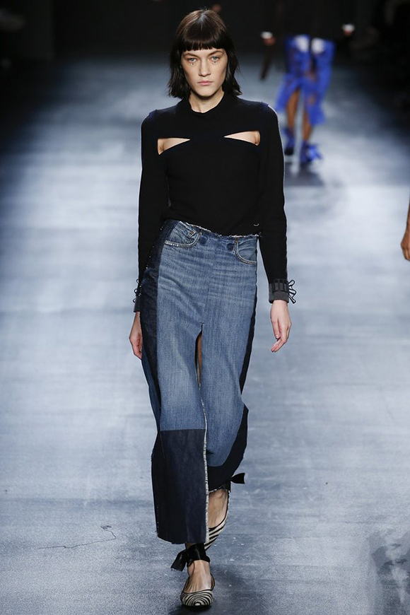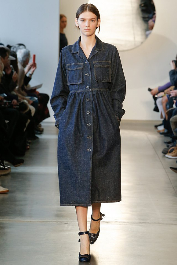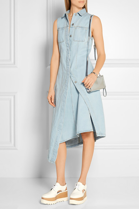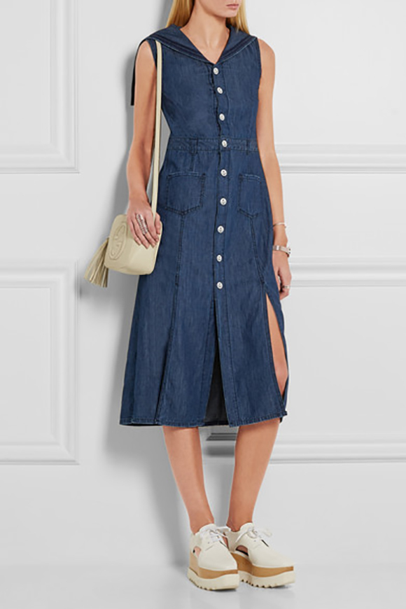 连身丹宁既可以像 Kenzo 这样充满设计感,用几何半圆从领口开到裙摆;也可以像 Suno 这种宽松衬衫领,微微的荷叶摆垂下来: